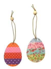 De eieren in het voorbeeld zijn versierd met textieltape; een soort plakband van stof met leuke printjes. Dat werkt heel eenvoudig en geeft een erg leuk resultaat.