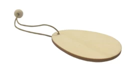 De hangers zijn van hout van ongeveer 3mm dik (lekker stevig dus). Aan de voor- en achterkant is het hout licht van kleur en het randje is donker. Natuurlijk zit er ook een koordje aan om ze op te hangen met daaraan nog een houten kraal.