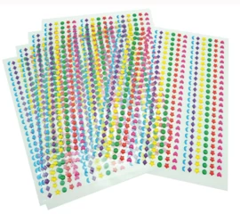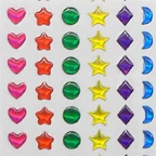De stickers zijn ongeveer 1 x 1cm (ligt een beetje aan de vorm van de sticker). Er zijn 6 verschillende stickers: roze hartjes, rode sterren, groene rondjes, gele sterren, paarse ruiten en blauwe maantjes.