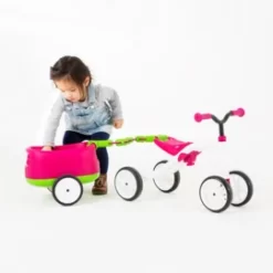 Een stabiele loopfiets met 3 wielen met een aanhangwagentje die