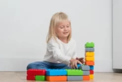 De blokken bouw je op elkaar als lego, of duplo. Maar ze zijn een stuk groter! De grote blokken zijn 11cm lang, 5,5cm breed en 3,5cm hoog. daar kan je dus echt indrukwekkende bouwwerken van maken.