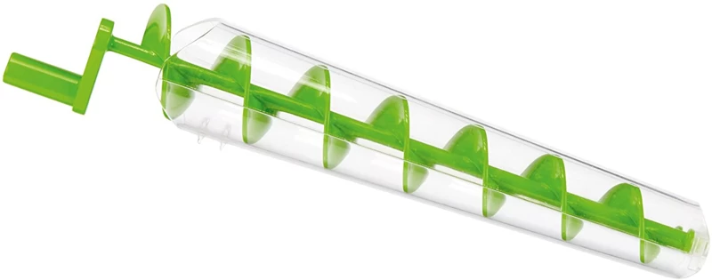 Ik heb deze schroef natuurlijk uitgeprobeerd. Met water werkt hij echt goed en nog leuker was het om het met rijst te doen, omdat je dat nog beter ziet (hoe leuk is dit in een sensobak met gekleurde rijst). Ik heb het ook geprobeerd met fijn, gekleurd zand. Maar dat was duidelijk te fijn; dat ging vastzitten tussen de schroef en de huls, dus dat liep niet lekker. Het leukste is het dus met vloeistof of kleine korreltjes.