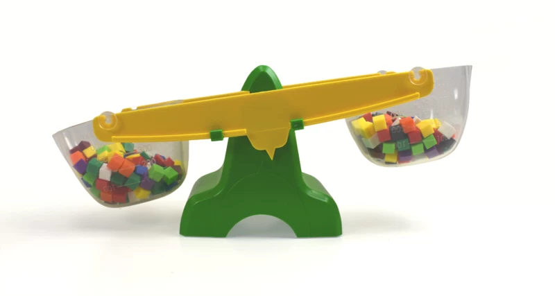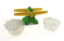 Probeer de pijl van de balans precies in het midden te krijgen, dan zijn beide bakjes dus even zwaar.
