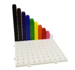 De set bestaat uit 10 setjes van 10 blokjes, elk in een andere kleur. De blokjes kan je op elkaar klikken. En je kan ze ook op het bord klikken! de “basis voor blokjes”. Daarmee vallen ze niet om en kan je alles nog duidelijker naast elkaar zetten, of in groepjes verdelen.