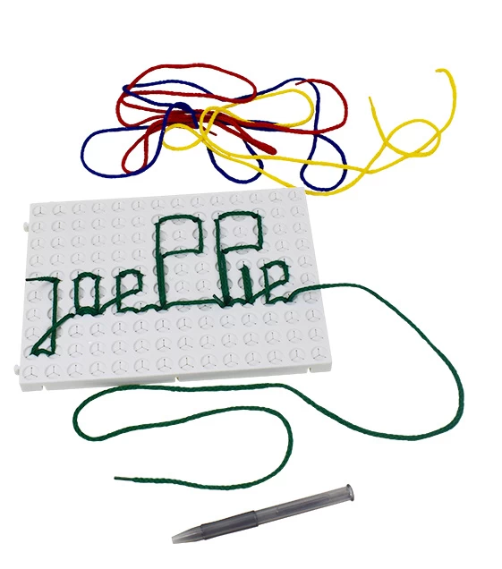 Uniek concept waarbij kinderen een creatie maken met rijgveters zonder dat je de naald er doorheen steekt… want dan zit ie ineens aan de achterkant en ben je het overzicht kwijt; dat is lastig als je klein bent.