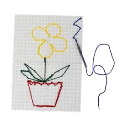Het bord is bijna 20cm breed en 14cm lang. Daarbij zit een borduurpen en 4 kleuren rijgkoord.