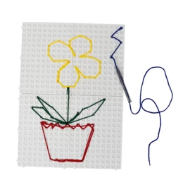 Dit is een heel flexibel, kunststof bord met kleine gaatjes. Daarbij zit een speciale holle pen. Je steekt het rijgkoord in de pen en laat het een klein beetje uitsteken… en dan ga je prikken. Van het ene gaatje naar de andere. En iedere keer dat je de borduurpen is zo’n gaatje prikt blijft het rijgkoord daar ingeklemd. Zo kan je ermee “borduren”
