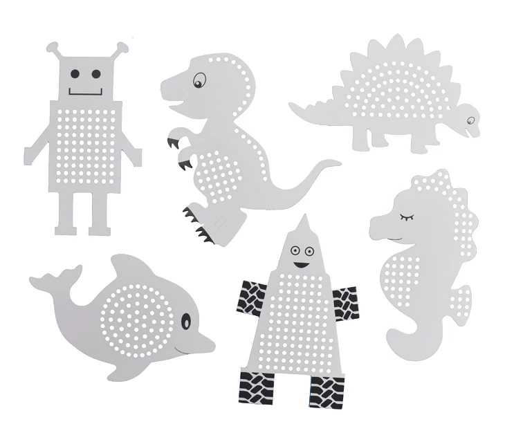 Met rijgveters, borduurgaren of wol kan je leuke patronen maken en zo de figuren “inkleuren”.