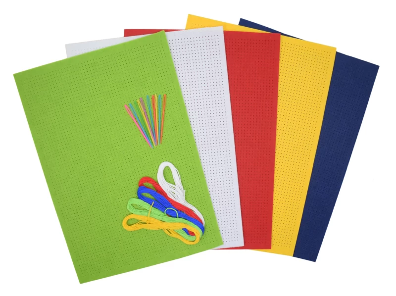 Set met 5 grote vellen borduurvilt (A4 formaat), bijpassend borduurgaren en 10 plastic borduurnaalden.