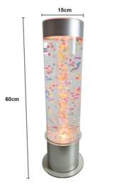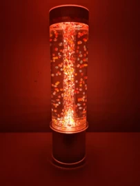Het is een brede, doorzichtige koker gevuld met water en gekleurde balletjes. Het mechanisme blaast er van onderaf een bubbelstroom in waardoor de balletjes gaan dansen.