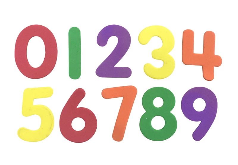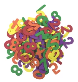 Grote zak met een heleboel cijfers van hobbyrubber (EVA foam) in verschillende kleuren.
