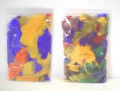 Vrolijk gekleurde veertjes om mee te knutselen. De veertjes zijn tussen de 7 en 10 cm.