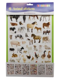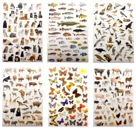 Er is een vel met boerderij-dieren-stickers, een vel met dierentuin-dieren-stickers, een vel met honden-en-katten stickers, een vel met vogel stickers, een vel met vlinder stickers en een vel met vissen stickers.