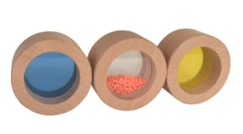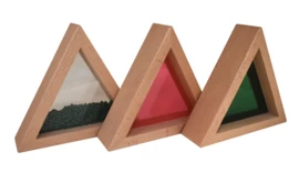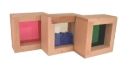 Er zijn 5 verschillende vormen, en van elke vorm zijn er 3 blokken. Twee van die blokken hebben een gekleurd venster en de ander heeft een venster van dubbel plexiglas voor de helft gevuld met gekleurde korrels. Deze korrels zitten er los in en bewegen dus als je het blok draait.