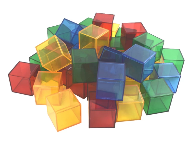 Set met 36 vierkante, transparante blokken in 4 verschillende kleuren.