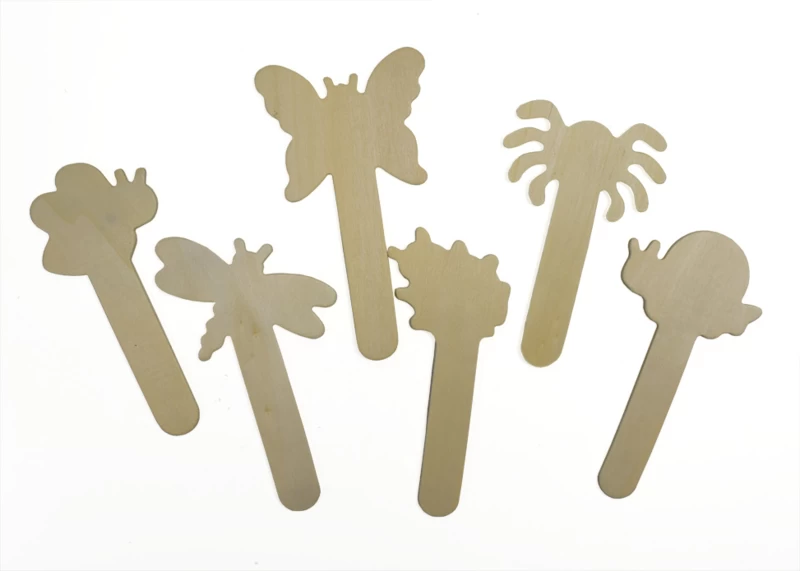 Set van 6 houten figuurstokjes met de figuren van verschillende insecten er bovenop.
