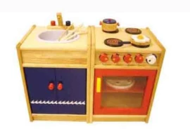 Basiselement van het keukentje; een fornuisje met een oventje. Het deurtje kan natuurlijk open en dicht en de knoppen kan je draaien.