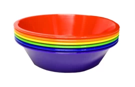 Het zijn ronde schaaltjes, die niet snel omvallen. In de kleuren rood, oranje, geel, groen, blauw en paars.