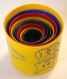 De toren bestaat uit 8 verschillende maten bekertjes die op elkaar kunnen en ook in elkaar passen.