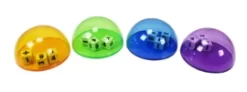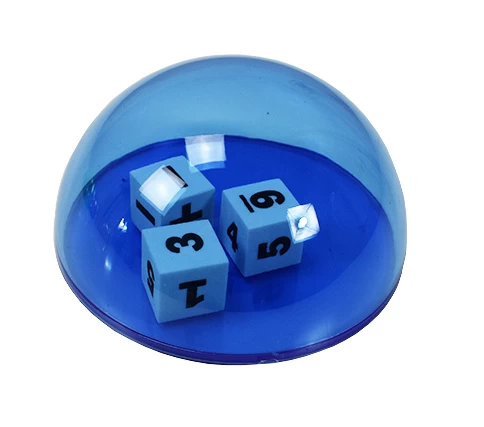 Een halve bol van transparant kunststof met daarin 3 duidelijke dobbelstenen.