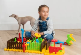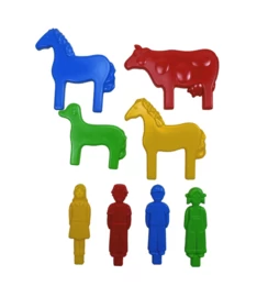 Bestaat uit een grondplaat van 36 x 36cm. Met daarbij 2 paarden, een koe, een hond en 4 poppetjes en daarnaast nog een heleboel hekjes en andere accessoires om er een echte boerderij van te maken.