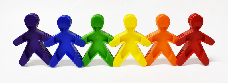 In een set zitten 18 popjes in 6 verschillende kleuren (dus 3 poppetjes van elke kleur). Die passen trouwens ook perfect bij de gekleurde sorteerbakjes!