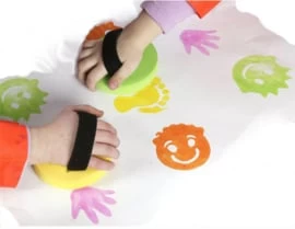 Set van 6 grote schuimrubber stempels. Op 4 van de stempels staan verschillende gezichtjes afgebeeld. Op 1 stempel staat een voet en op de ander een hand. Met deze stempels kan je dus mensjes stempelen.