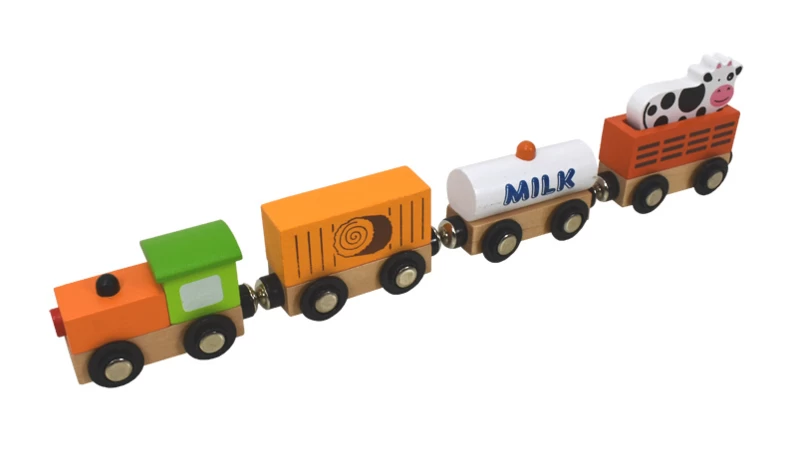 Houten trein die bestaat uit 4 wagonnetjes die met magneetjes aan elkaar vastzitten.