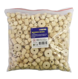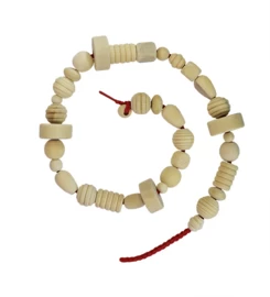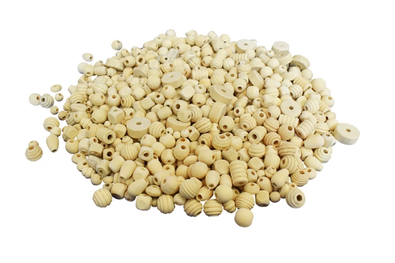 Een hele mooie set van ongelakte, houten kralen in verschillende maten en vormen.