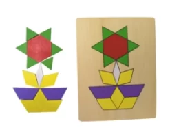 Mooie houten opbergkist met heel veel houten mozaiekstukken en 5 voorbeeldplankjes die aan 2 zijden bedrukt zijn.