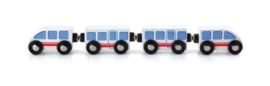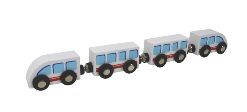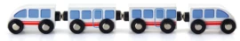 Houten trein die bestaat uit 4 wagonnetjes die met magneetjes aan elkaar vastzitten.