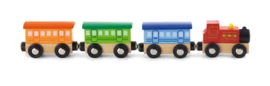 Houten trein die bestaat uit 4 wagonnetjes die met magneetjes aan elkaar vastzitten.