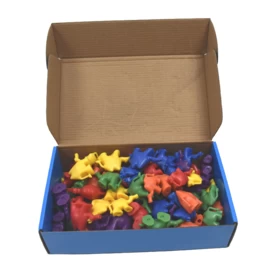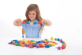 Je kan ze sorteren op kleur, of op maat. Je kan ze wegen. En het allerleukst zijn ze in combinatie met de “kamelen volgorde kaarten”. Dit zijn opdrachtkaarten waar patronen op staan die je na moet maken. En als je dat al goed kan kan je het patroon misschien zelf wel langer maken… Je moet goed kijken naar de kleur en de afmetingen van de kamelen.