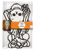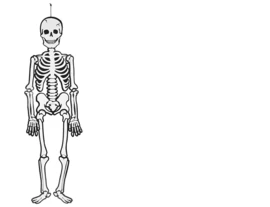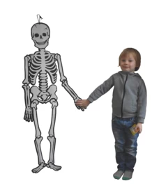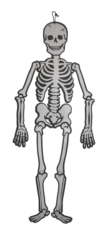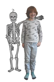 Skelet van karton waarbij de onderdelen met splitpennen aan elkaar vast zitten op de plek van de gewrichten, waardoor het hele skelet kan bewegen.