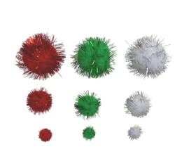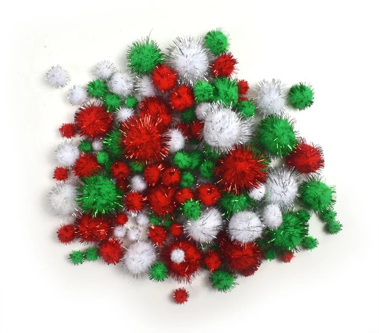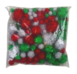 Zak met 130 glitter pompoms in d kleuren wit, groen en rood.