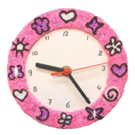 Als je de klok versierd hebt zet je vanaf de achterkant het uurwerk erin en dan aan de voorkant in de juiste volgorde de wijzers (zit een goede beschrijving bij). Als je er dan zelf nog een batterijtje in doet heb je een zelf gemaakte klok.