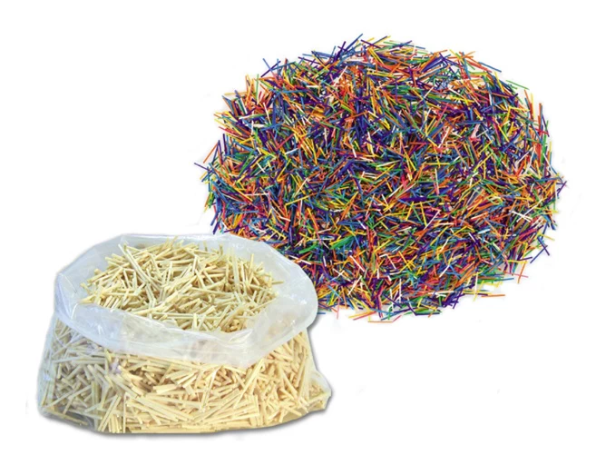 Deze houtjes zijn verkrijgbaar in een gekleurde en een ongekleurde variant. En van beide varianten hebben we zowel een grote zak (ongeveer 5.500 houtjes), of een kleine zak (ongeveer 1000 houtjes)