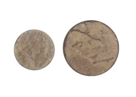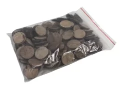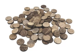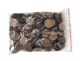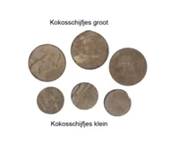 Zak met 250 gram ronde schijfjes gemaakt van de schil van een kokosnoot.