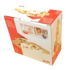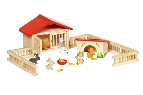 In de set zit: een groot hok met 2 klapdeuren en een drinkflesje, 8 hekjes, een klein hokje, 6 konijntjes, 6 wortelen en een voederschaal.