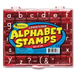 Doos met daarin 34 stempels. Voor alle letters van het alfabet en ook nog een heleboel leestekens.