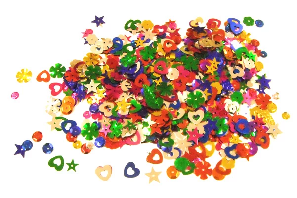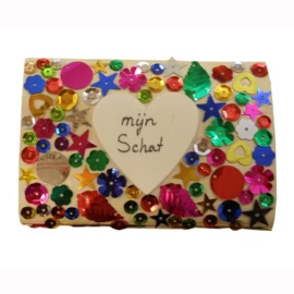 Zak met glimmende lovertjes in allerlei figuurtjes zoals bloemen, rondjes, hartjes, sterretjes en nog meer…