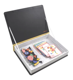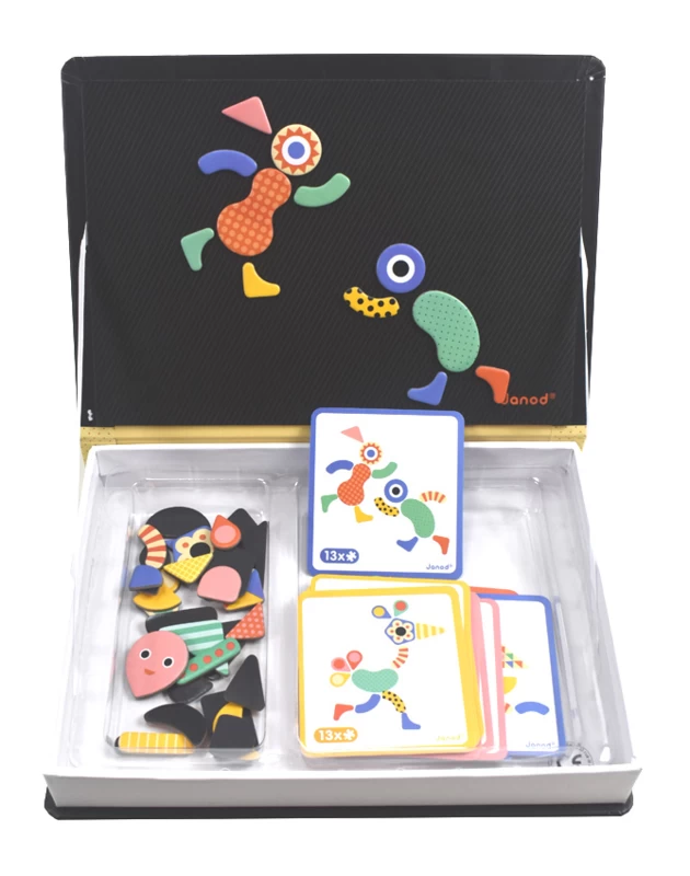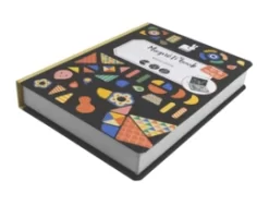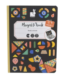 In deze set vind je voorbeeldkaarten en heel veel gekleurde, geometrische magneetvormen. Dit zit verpakt in een doos die, als hij dicht is lijkt op een boek. Als je hem opent blijft de klep mooi openstaan door de 2 koordjes aan de zijkant. Deze klep is metaalhoudend, waardoor de magneetfiguren er goed op blijven plakken.
