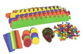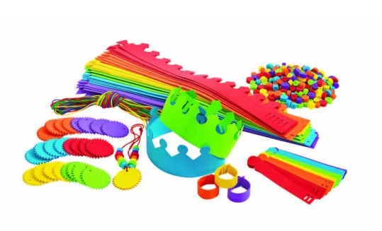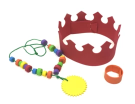 Heel compleet pakket met 24 kroontjes van rubberfoam, 24 armbanden van rubberfoam en 24 medailles van rubberfoam met rijgsnoeren en rubberfoam kralen.