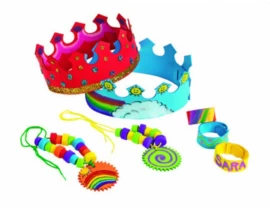 De artikelen zijn te versieren met verf en met van alles en nog wat te beplakken. De kroontjes en de armbanden hebben een sluitsysteem dat je gewoon in elkaar schuift, dus daarvoor hoef je niks te lijmen of te nieten (kan eventueel wel natuurlijk). En omdat alles gemaakt is van zacht en soepel rubberfoam zit het ook gewoon fijn.