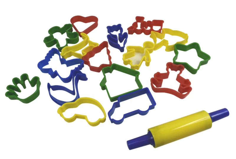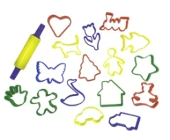 Een set met 16 grote uitsteekvormen voor klei en ook nog een kunststof klei roller.