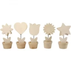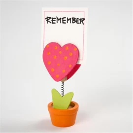 Klein houten bloempotje met daarin een bloemetje. Het bloemetje heeft 2 plaatjes met daartussen een klein knijpertje. Daardoor kan je een foto, een papiertje of iets anders erin vastklemmen.