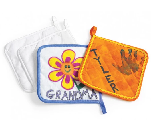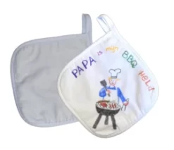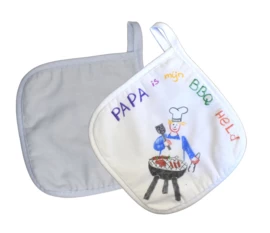 Versier je eigen pannelap (of barbecuelap) met textielstift of wasco, of als je al heel handig bent kan je hem zelfs borduren.