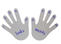 De handjes zijn van glad, effen wit papier. Elk handje is zowel een linker- als een rechterhand (door hem om te draaien).
