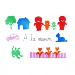 Met afbeeldingen van 3 maten poppetjes (papa/mama, groot kind en klein kind), een huis, een hond, een poes, een auto en een tuin met hekjes, bomen en bloemen.