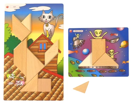 Een bijzonder tangram spel met grote blokjes en inlegkaarten. Met de tangramblokjes vul je de openingen van de voorbeeldkaarten. Als je de kaart gevuld hebt zie pas goed wat er op het plaatje staat.